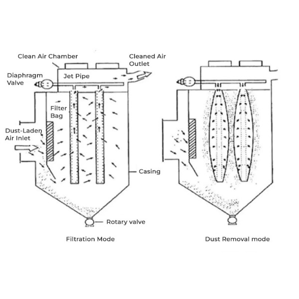 Tisztítási mechanizmus: Egy olyan mechanizmus, mint az impulzussugaras vagy rázórendszer, amelyet a szűrőtasakok rendszeres tisztítására használnak az optimális teljesítmény biztosítása érdekében.