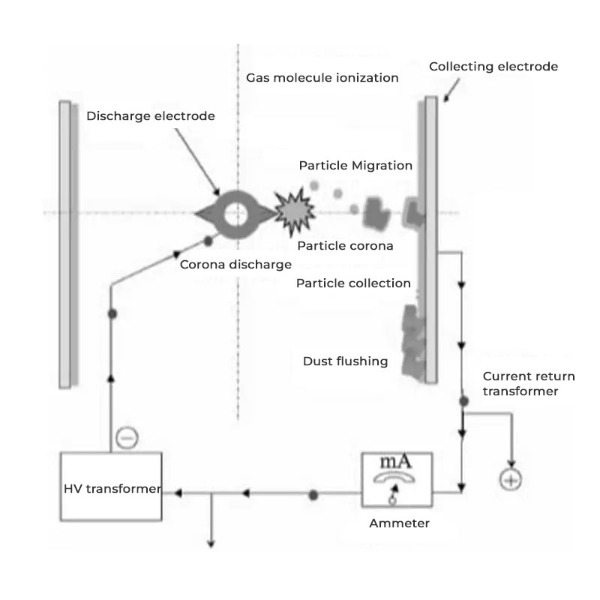 A részecskék ionizációja: Amikor a füstgáz vagy a távozó levegő belép a leválasztóba, a kisülési elektróda nagyfeszültségű elektromos mezőt hoz létre. Ez a mező ionizálja a lebegő részecskéket, és negatív töltést ad nekik.